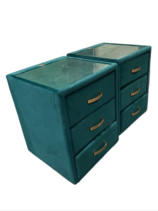 Dark Turquoise Emerald Glass Top Velvet Bedside Tables (Pre-Loved)